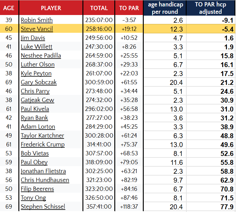 Those are very different modes, which is why I (mostly) stopped making shorts. Nobody has ever come up to me at an event and told me "your speedgolf meme changed my life". The people who go from viewer or reader → actual speedgolfer, they're watching long form videos or reading this newsletter. Quantity vs. quality. Leveling The Speedgolf FieldOn Saturday mornings, Paul Obey lines up at his local parkrun with a motley crew: twenty‑somethings, fifty‑somethings, and a legend in his 90s who still shows up to compete. They finish the 5K, check their phones, and boom — everyone gets an age‑graded percentage that tells them how their run stacks up against the best in their age group. Different ages, same scoreboard. Fair banter restored. Speedgolf should steal that. Here’s the pitch: introduce age‑adjusted rankings alongside the traditional board. We all know VO₂ max drops roughly 5–10% per decade after 30 (unless your name is Luther Olson). In other words, endurance and recovery decline predictably at a population level. That doesn’t mean 50+ athletes stop competing. It means we calibrate results so effort and skill are more apparent. Masters sports figured this out years ago. Track, triathlon, rowing — they use age‑grading to compare performances fairly. We can too. Filip "SpeedStache" Beerens (desperate for any edge he can get!) has already created age-adjusted US Open results (for the golfers who supplied their birthdays). Notice 60-year-old Steve Vancil vaulting everyone but World #1 Robin Smith. When it comes to age-related questions, the one we haven't agreed on as a community is tee boxes. At the European Speedgolf Open, seniors played from the same tees as the Open division, meaning Joakim Wikland could compete for the Senior title and the Open title at the same time (which I like). The US Speedgolf Open was a completely different story. All men's age groups played a tee box up (which I liked for a different reason -- it made me feel like a bomber). But that meant that Steve Vancil couldn't play for both the Open and Senior titles (he would've won the 40+, 50+, and 60+ divisions!). He had to pick. I say: let us have our cake and eat it too. If a speedgolfer wants to "go big" like Wikland or Vancil, they play from the Open tees and give their competitors a couple hundred yards advantage. If a speedgolfer wants to lock in their age group, they play up a tee box, but are not eligible for the Open title, no matter how low they shoot. Upcoming EventsSpeedStache politely reminds you that if you're planning to play in the Virtual Indoor Speedgolf event in December, now is the time to line up your simulator location!